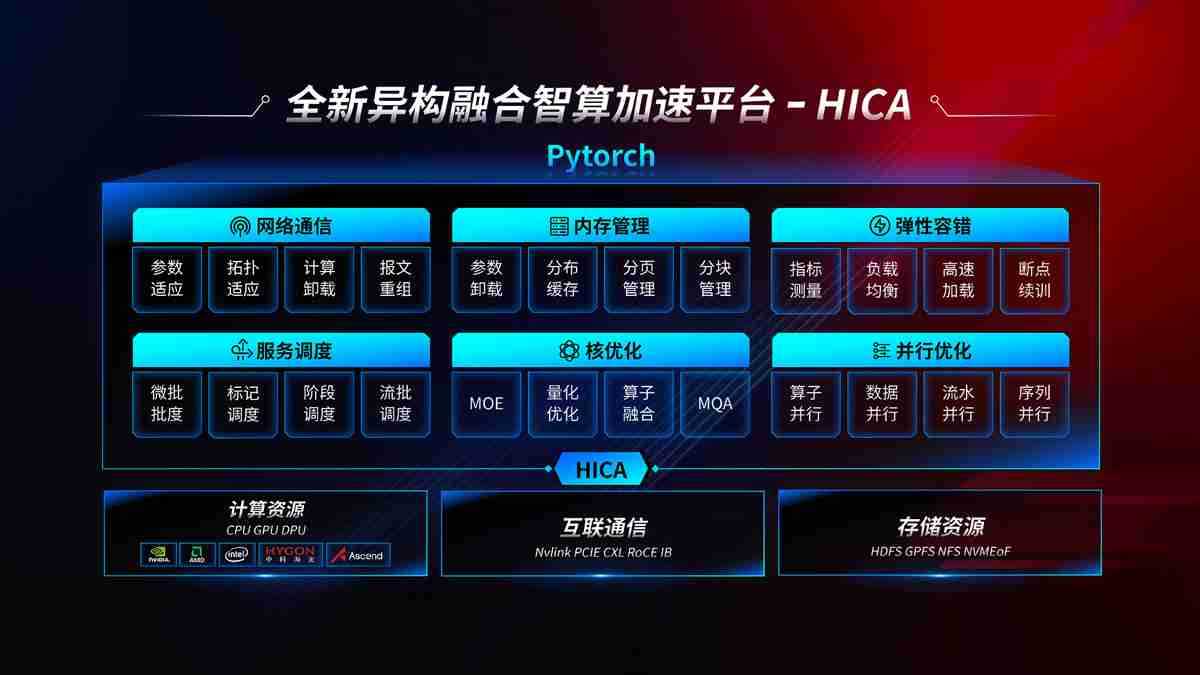 通过自研的服务层、、、中间适配层、、、、以及调度编排算法,,,,采用数据并行、、模型并行等多种并行方式,,,把并行计算任务进行有效的分解,,,,使其分别由相应的软件栈和算力资源来承接。。。当GPU资源变化,,HICA可以实时动态调度计算子任务并调整模型拓扑和架构,,,以充分聚合各种算力资源。。