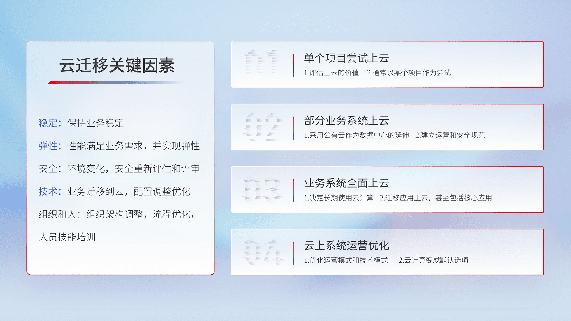 结合实际业务,,,从规划设计、、、云平台选型、、、、云原生改造、、、、数据迁移、、集成交付,,,,迁移全过程为客户识别最佳上云路径,,,,做好风险识别管理,,,设计网络架构、、、身份权限、、、、安全审计合规、、、、操作审计、、日志审计、、、监控告警策略、、多站点容灾设计等,,对云上基础设施进行整体规划,,提升IT治理水平,,,,以满足弹性、、、高可用、、高性能的需求。。。
