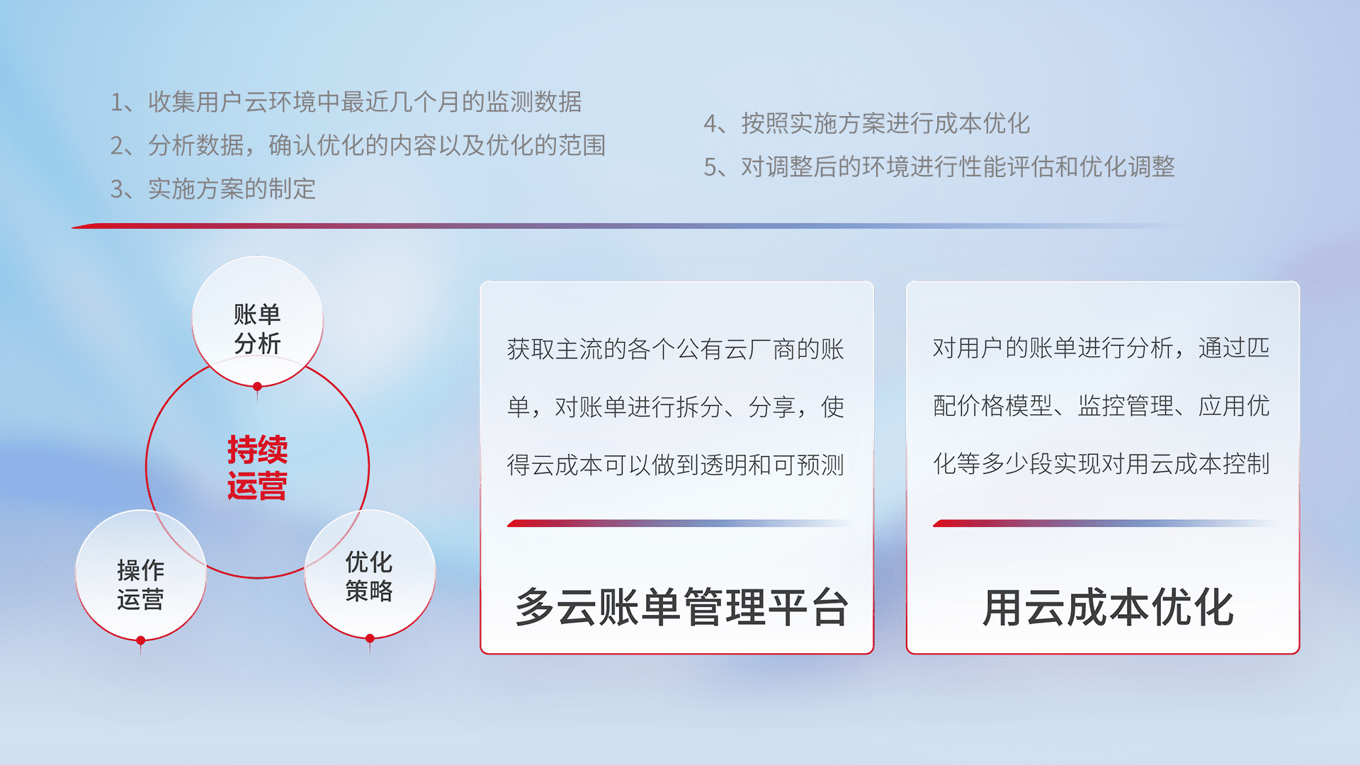 通过多云纳管,,,,以统一的资源数据模型把客户的云资源进行抽象和封装,,,,进而实现对多云资源的统一操作,,保障云资源管理的可靠性、、稳定性与可用性。。量身定制化运维内容,,,配置、、、开发运维、、、补丁管理、、备份、、、监控、、、、认证和访问管理、、、审计和日常巡检等,,,保障在用云过程中的可靠度,,,,稳定度以及高可用率。。。。